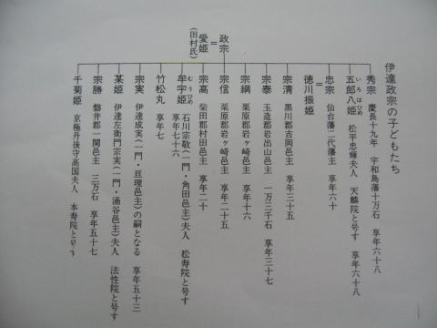 | 伊達政宗の系図 この系図を見れば、側室が少なくても7人いたと言うのもうなずけます。 |