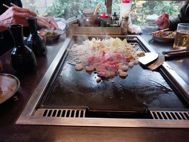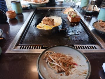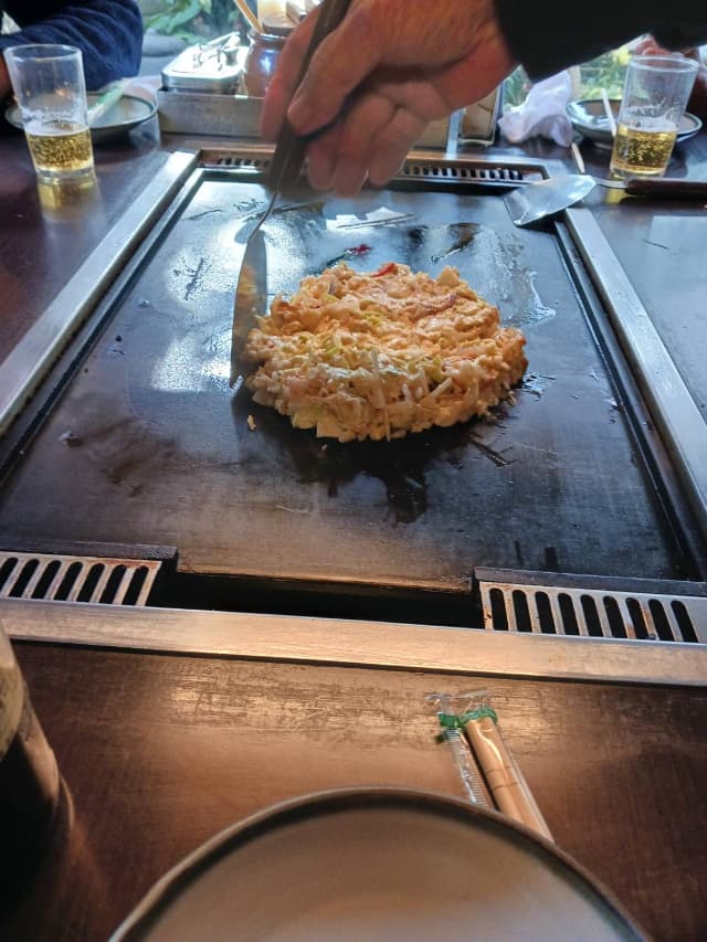まずお好み焼き津久井を2セット次に焼きそば2セットビールをとりしめは豆腐の手板焼き全て調理を店の人がしてくれました。