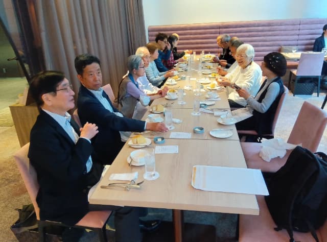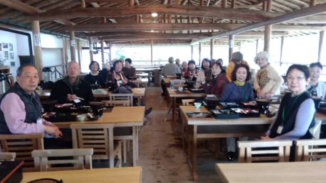 広々とした食堂・ビジネス・打ち合わせ場所から展示フロアーに移動し集合写真。