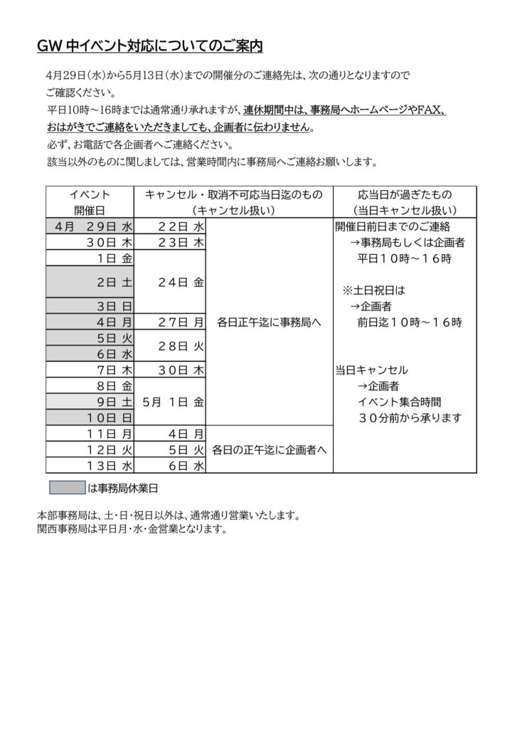 - ゴールデンウィークの事務局案内