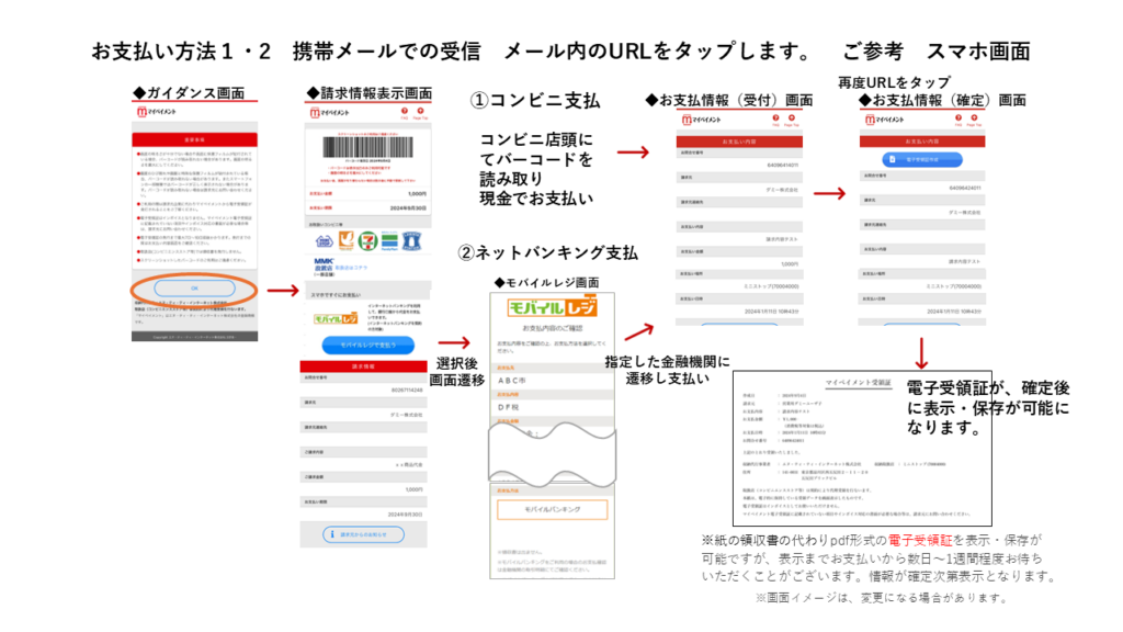 メール受信後、10日以内にマイペイメントの① コンビニでの現金払いか ②モバイルレジのネットバン